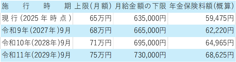 厚生年金の標準報酬月額の上限は、以下のように段階的に引き上げられる見通しです。